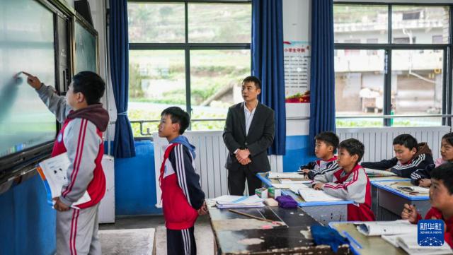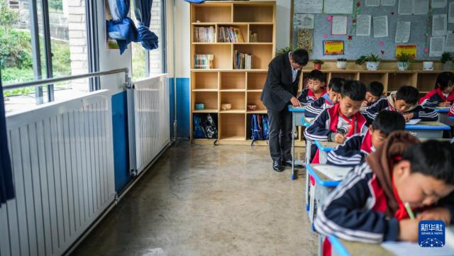 △老师指导孩子们在供暖的亮岩小学学习。新华社记者 陶亮 摄
