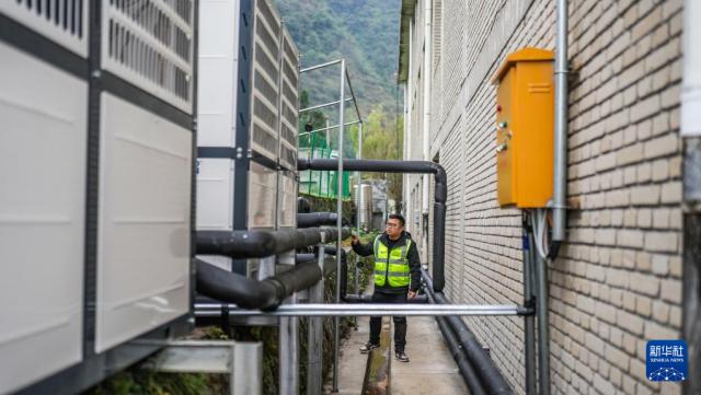 △工作人员正在检查亮岩小学的供热设施。新华社记者 陶亮 摄