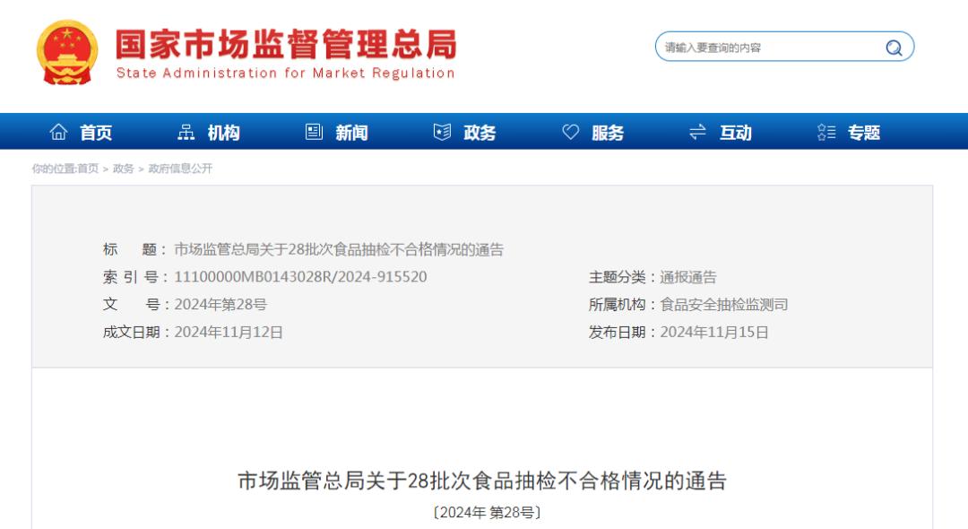 近日,市场监管总局组织食品安全监管抽样1600批样品,发现28批样品不合格。相关省市场监管部门已组织对抽样发现的不合格食品进行审查。