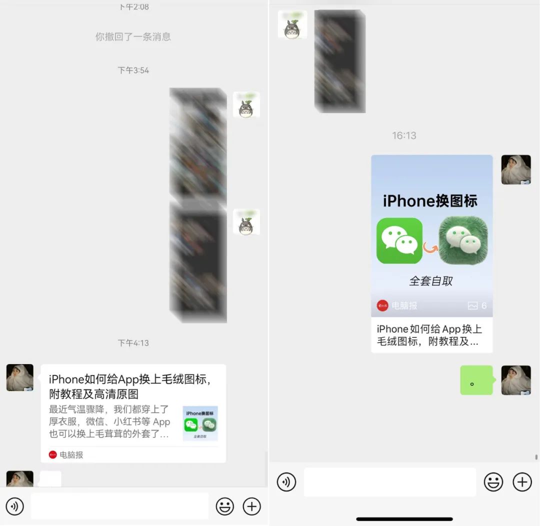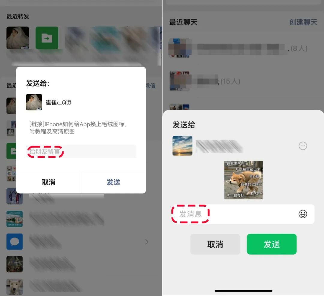 此外,还有一个隐藏的深刻变化,即消息转发界面已经修改。首先,显示模式从之前的中间弹出窗口改为从底部弹出的半屏页面,输入框中的“给朋友留言”提醒变成了“发送信息”。灰色框架和绿色框架也用于区分“取消”和“发送”按钮: