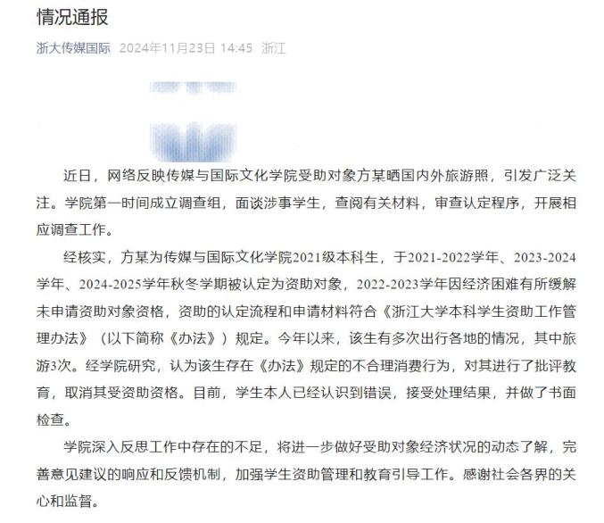 经核实,方某是传媒与国际文化学院2021级本科生,2021-2022学年、2023-2024学年、2024-2025学年秋冬学年被认定为资助目标,2022-2023学年因经济困难而未申请资助目标资格,资助的认定流程和申请材料符合《浙江大学本科学生资助管理条例》(以下简称《办法》)。从今年开始,这个学生已经在各个地方旅行了好几次,包括三次旅行。经过大学研究,认为该生存存在《办法》规定的不当消费行为,对其进行了批评教育,取消了其资助资格。现在,学生本人已认识到错误,接受处理结果,并进行书面检查。