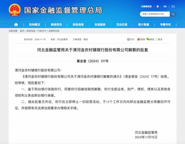 批准文件显示,考虑到邢台银行收购清河金农村镇银行,沙河襄通村镇银行,河北省金融监管局于 11 月 15 日本同意这两家乡镇银行因收购而解散。邢台银行继承了两家银行的所有业务、资产、债务、债务等权利和义务。