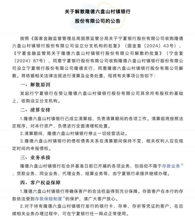 11 月 22 日本,由于被宁夏银行收购,金融监管总局官网发布的行政许可信息显示,最近,隆德六盘山村镇银行被允许解散。