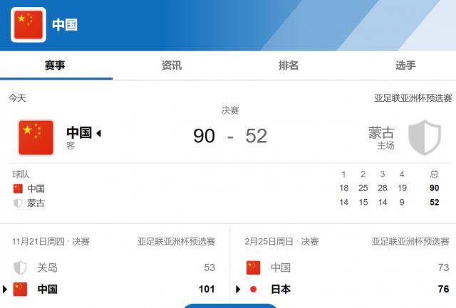 昨天下午,中国男篮以 90 比 52 蒙古男篮总比分击败。