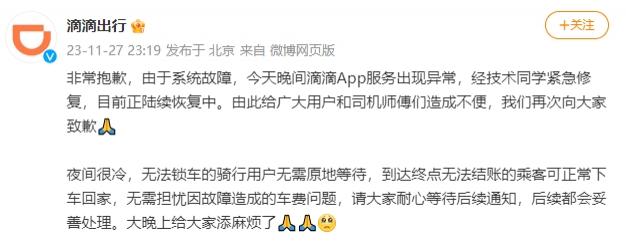对于这一点,“滴滴出行”微博回应说:很抱歉,因为系统异常,晚上滴滴。 App 服务异常,经过技术生的紧急修复,目前正在陆续恢复。不能锁车的骑自行车用户不需要在同一个地方等待。到达目的地不能结账的乘客可以正常下车回家,不用担心故障导致的车费。请耐心等待后续通知,后续会妥善处理。
