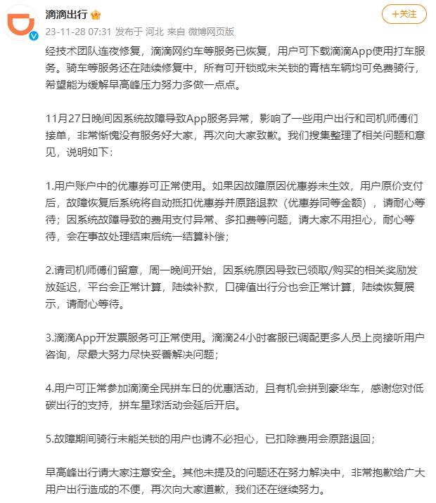 28 日上午,“滴滴出行”微博再次发文称:经过R&D团队连夜修复,滴滴等服务已经恢复。com和汽车,用户可以下载滴滴。 App 使用出租车服务。骑车等服务仍在陆续修理中,所有可开锁或未关锁的青桔车都可以免费骑行。