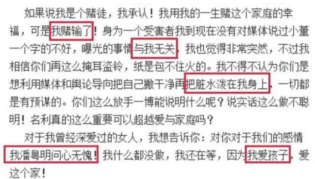 他说:“我潘粤明无愧于心!我什么也没做,我还在等,因为我爱孩子,爱这个家!”