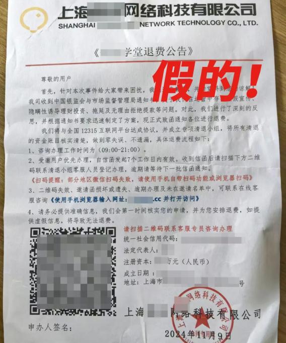 最近有市民报警求助,说收到快递包裹,包裹里有培训机构的退款公告,还附有退款客服的联系方式。其实这是骗子以退款的名义伪造政府机构、企业、机构文档的骗局!让我们看看这个案子↓