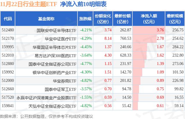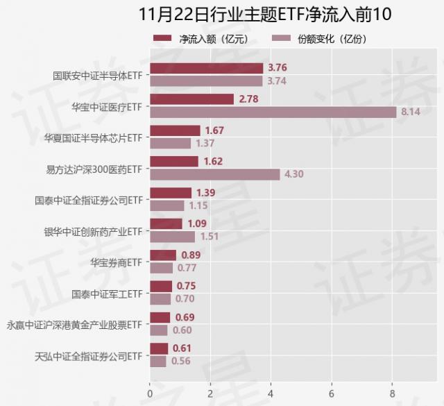 当天有 111 只行业主题 ETF 资金净流入显示,其中国联安中证半导体净流入排名第一。 ETF(512480),份额增加 3.74 十亿份,净流入额为 3.76 亿元。