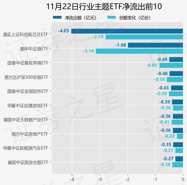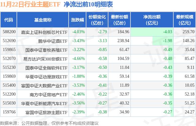 当天有 124 只行业主题 ETF 资金净流出,其中嘉实上证科技创新板芯片净流出排名第一。 ETF(588200),份额下降 2.79 一亿份,净流出额为 4.03 亿元。