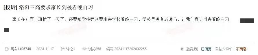 近日,有网友发帖称,洛阳三高坚持要求父母去学校看晚修,对此不满:“父母忙了一天工作,还要被硬性要求去学校看晚修。学校没有老师吗?”另一位网友说:“我们都迫不及待地想看到孩子的晚修状态,直到你抗议。”