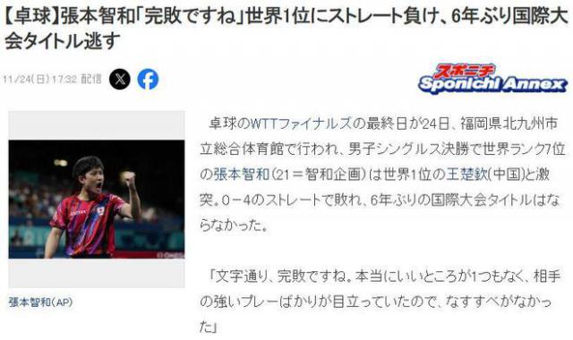 日本媒体《日刊体育》指出:“世界第一。 7 在与世界第一的张本智和 1 王楚钦时,以 0-4 输掉四场比赛的方式。他已经输了。 6 2008年没能在国际比赛中夺冠!