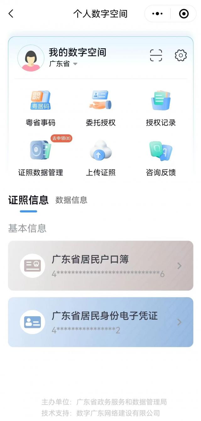 进入粤省事 APP或小程序,首页点击"数字空间",可以一键提供居民身份电子凭证。