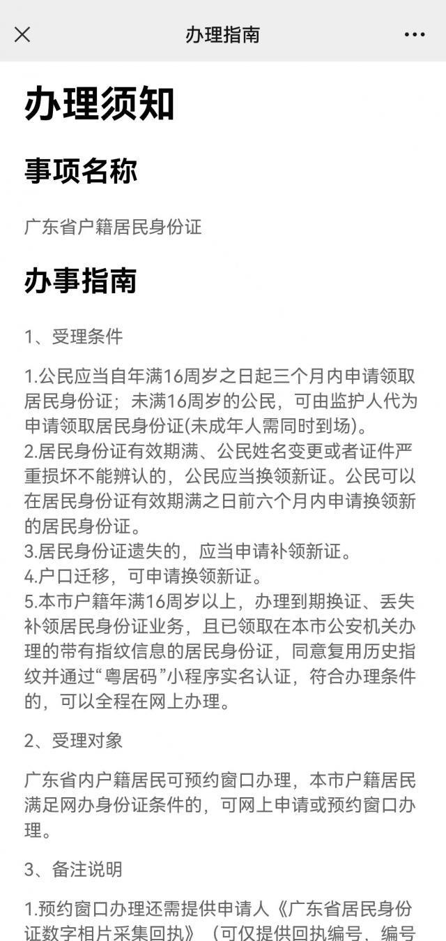 16 岁以上广东省户籍居民可先到照相馆拍摄居民身份证照片,取得广东省居民身份证数字照片采集检测回执后,选择附近的公安机关。居民身份证自助受理机办理。