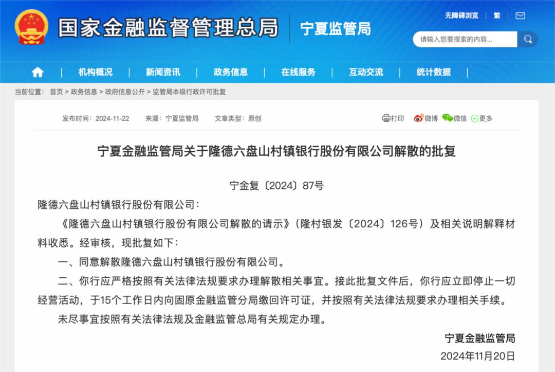 十一月二十二日,金融监管总局官网发布的行政许可信息显示,隆德六盘山村镇银行因被宁夏银行收购而被批准解散。