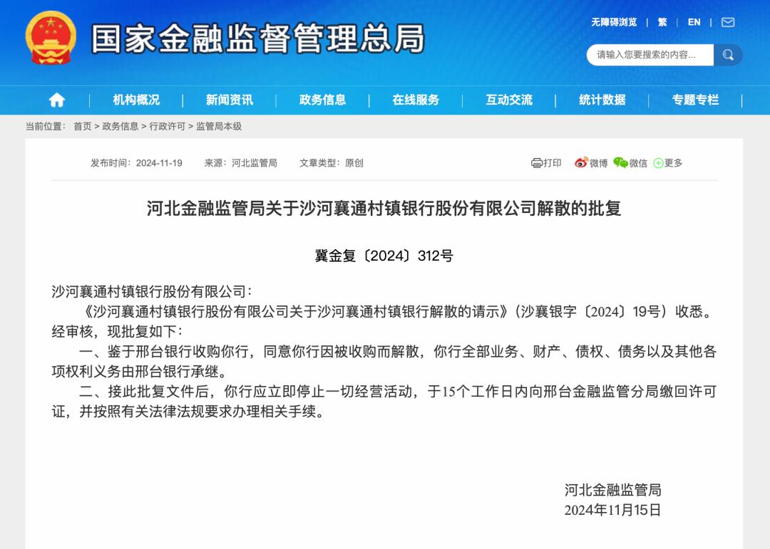 清河金农村镇银行、沙河襄通村镇银行因被邢台银行收购而被批准解散。