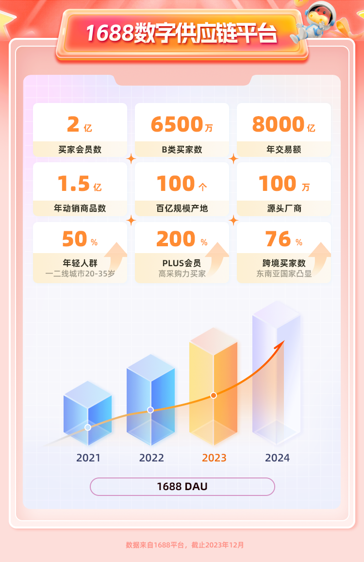 这样就给1688带来了新的增量。2023年,1688平台年营业额一举超过8000亿元,在B端业务、跨境业务、C端客户赛道等方面的努力。