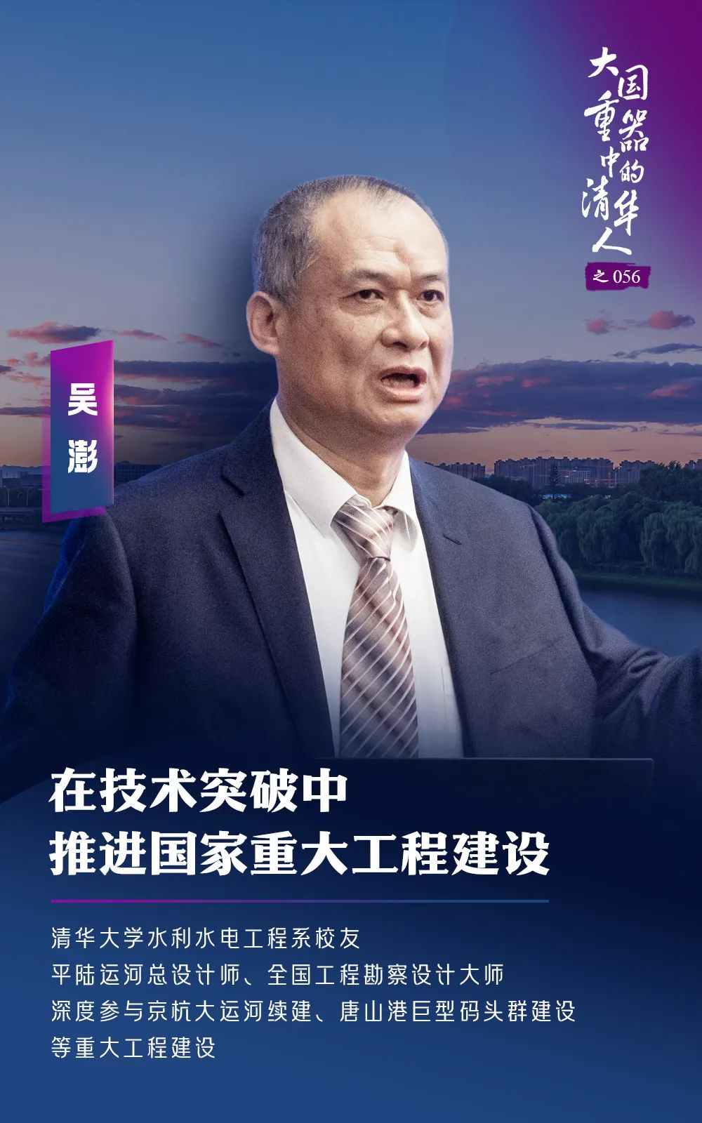 从助理工程师开始,在清华“自力更生、天道酬勤”校训的指导下,吴澎秉承“没有创新就没有技术进步”的理念,在处理实际工程问题上不断取得技术突破,制作了一批集约化、环保化、高效化的港航工程,成为2008年“全国工程勘察设计大师”荣誉称号的教授级高级工程师。