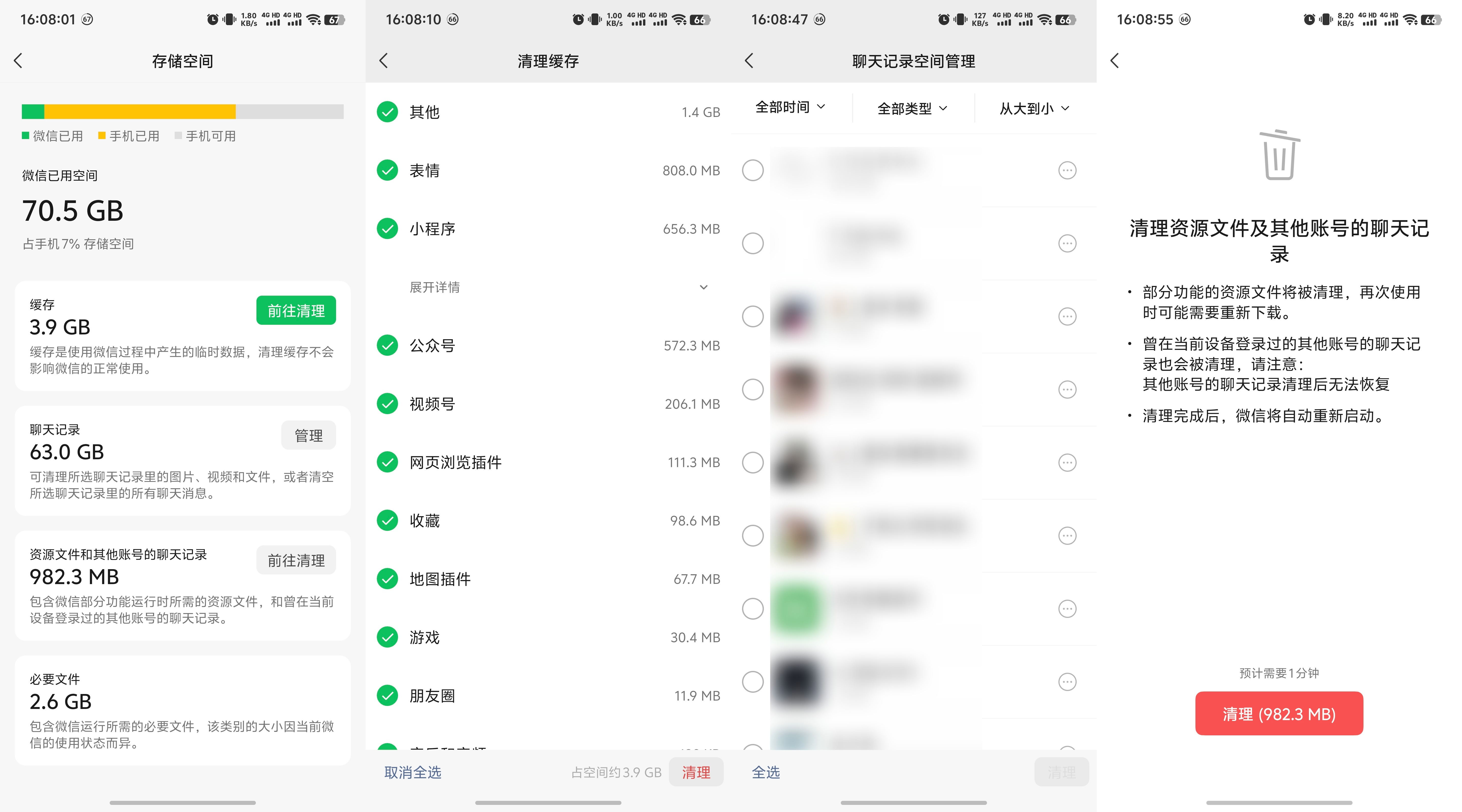 其实微信微信检测这个新功能并不是一时兴起。为了占用存储空间,微信早在几个大版本之前就有了很大的提升。在微信的“设置”——“存储空间”中,有三个清理选项:缓存、聊天记录、资源文件等账号的聊天记录,这些选项下有细分项目。
