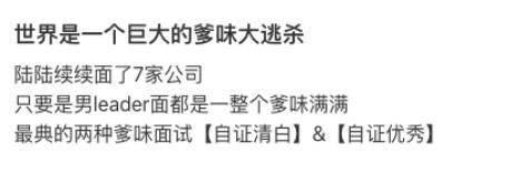 关于小红书「爹味」一个词的访问量接近4800万。博主@热心市民芝麻分享了自己接连面试7家公司后,发现了两种最经典的面试形式。第一,你需要证明自己的清白;第二,自我证明很好。