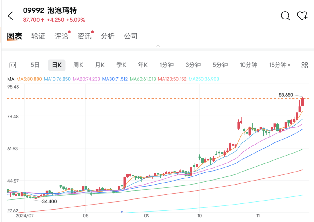 十一月二十五日,泡泡玛特逆势上涨5%以上,收入87.7港元,自2021年3月以来创下新高。