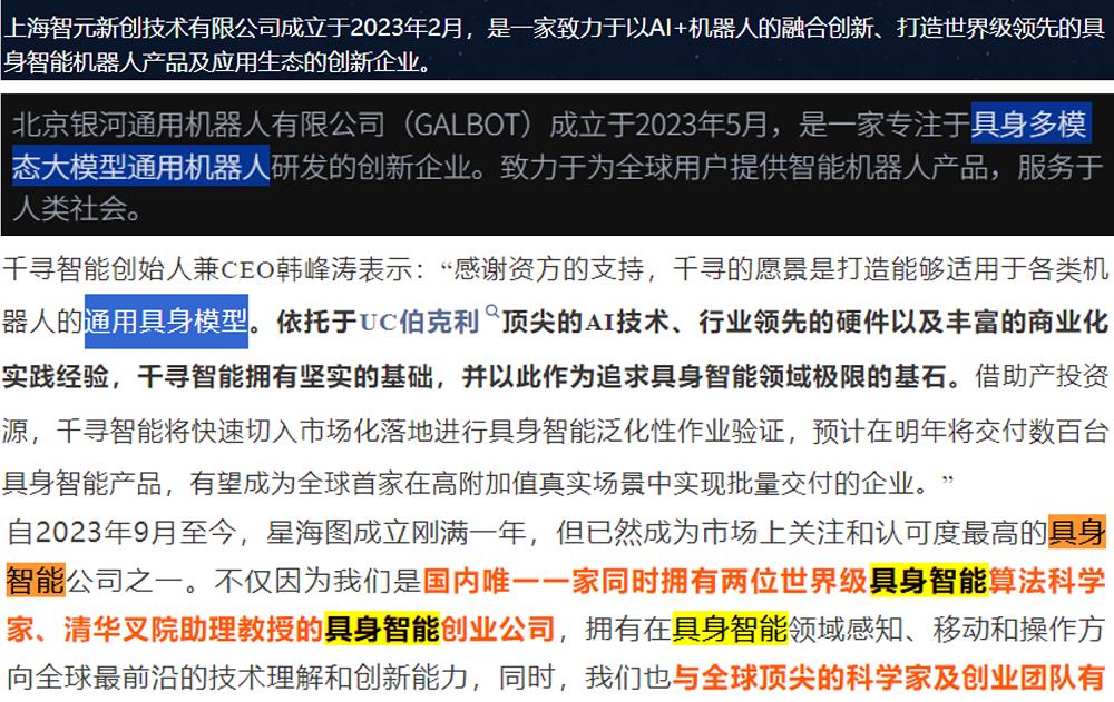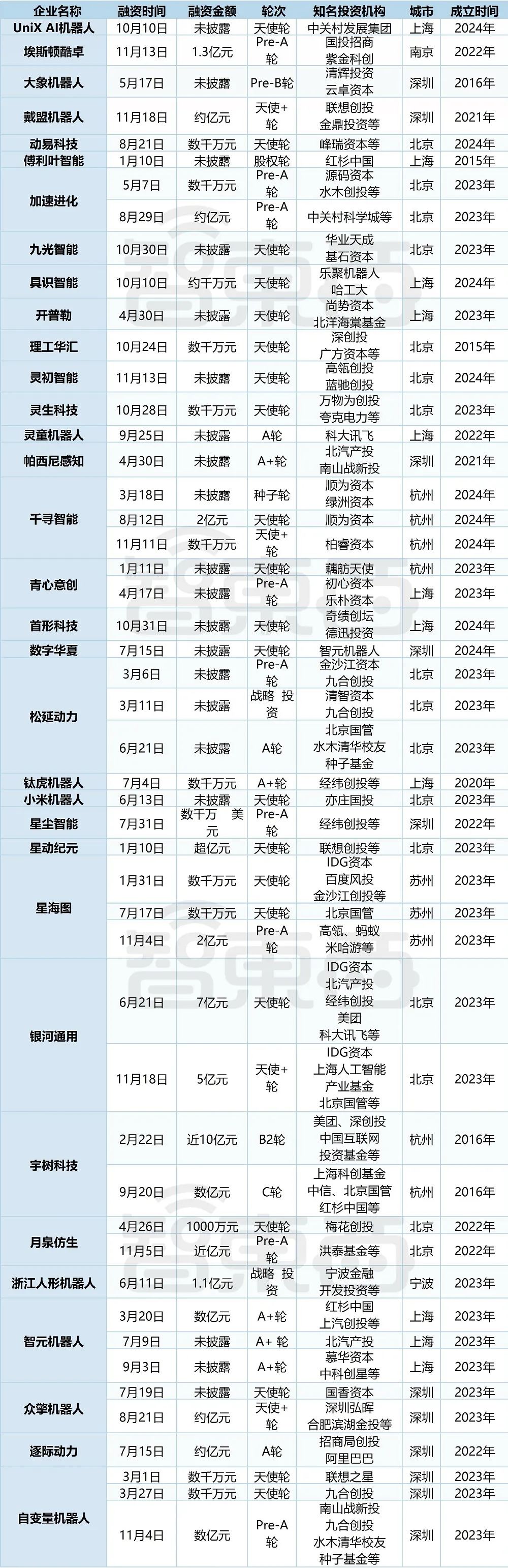 其中,银河通用、星海图、松延动力等。成立于2023年,千寻智能、首形技术、知识智能等。成立于2024年。