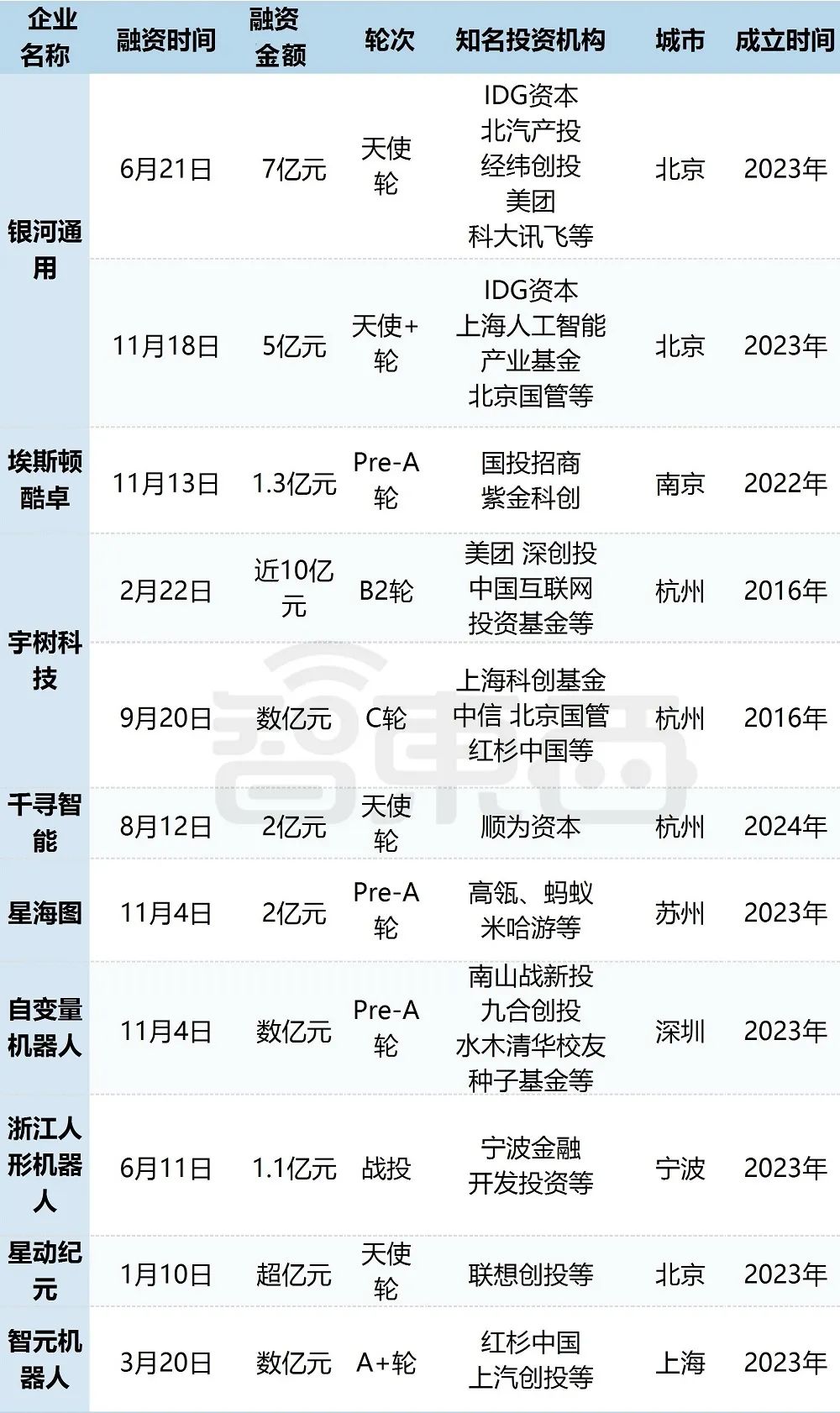 智源机器人、星海图、千寻智能今年获得三笔融资,其中多笔融资等级为1亿元。智源机器人获得SAIC风险投资、BAIC风险投资、红杉中国等机构的赌注。