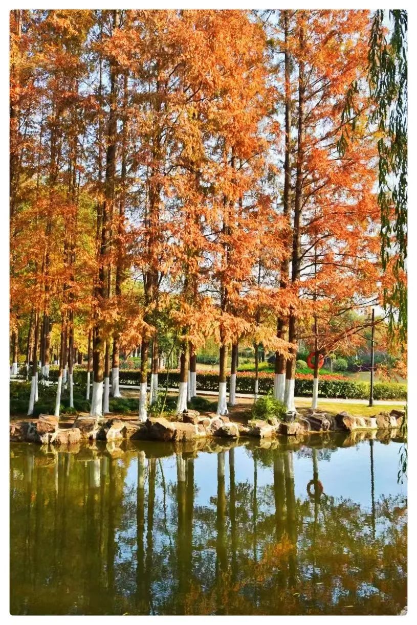 湖边的树木换上了橙色的新装。