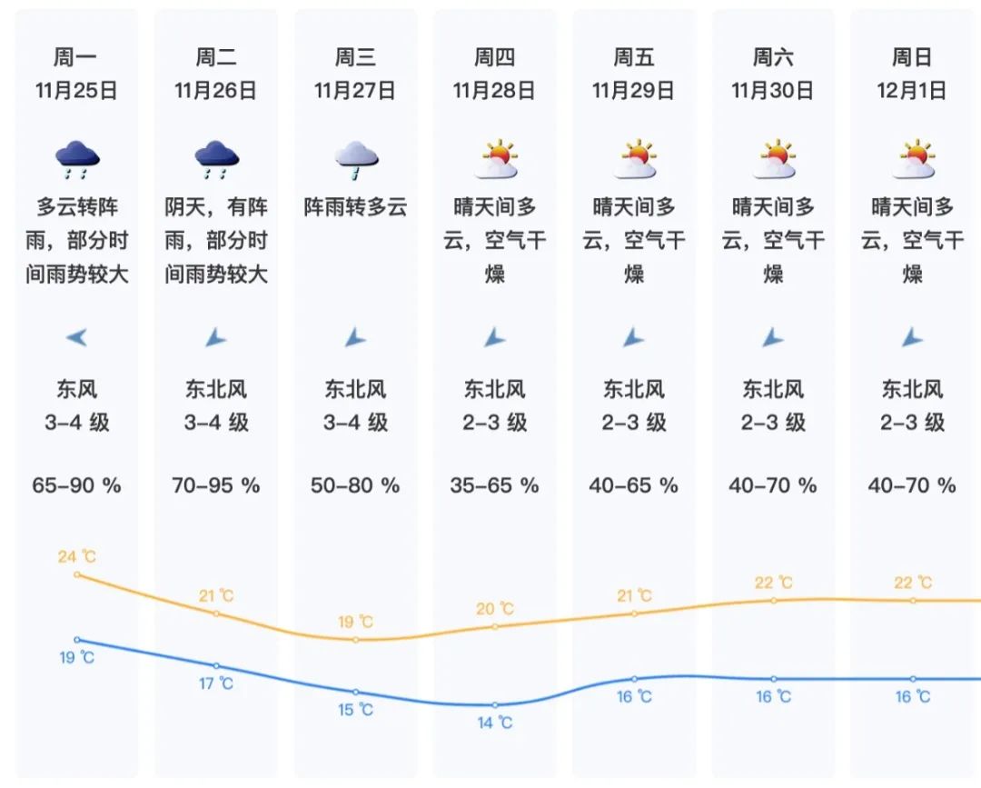 十一月二十五日,阴天转阵雨,部分时间雨势较大;气温19-24℃;东风3-4级,相对湿度为65%-90%。