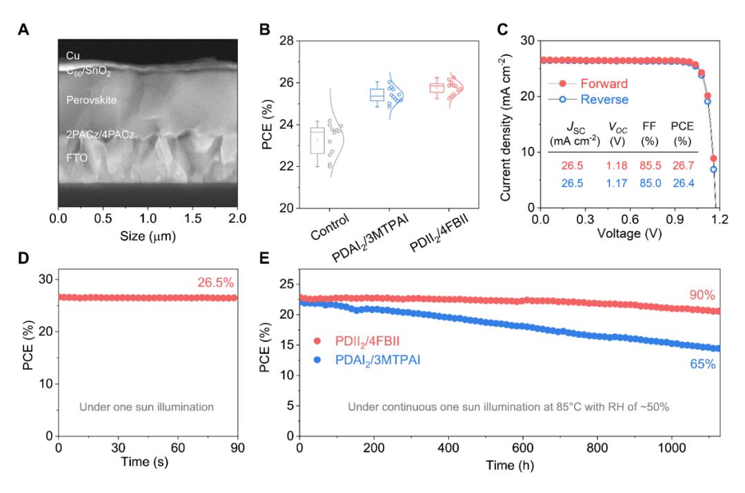 A.设备结构截面SEM图像。B.PCE统计数据,对照组,PDAI2/3MTPAI和PDII2/4FBII钝化器件。C. J-V曲线是PDII2/4FBII钝化器件的最佳选择。D. 稳定的PDII2/4FBII钝化器件输出效率。在85°C、在空气中50%相对湿度,1太阳光照条件下,玻璃封装装置的最大功率点(MPP)稳定跟踪。