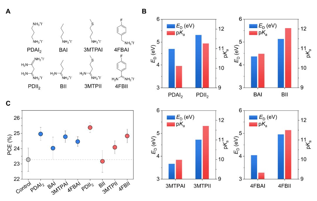 A.本研究所使用的配体分子结构。通过DFT计算得到的铵基配体及其对应的N-H解离能力(ED),以及通过0.05 0.05,N配体溶液 N 酸解离常数由NaOH滴定测得。(pKa)值。C. PSCs采用不同配体钝化的光电转换效率(PCE)对比。