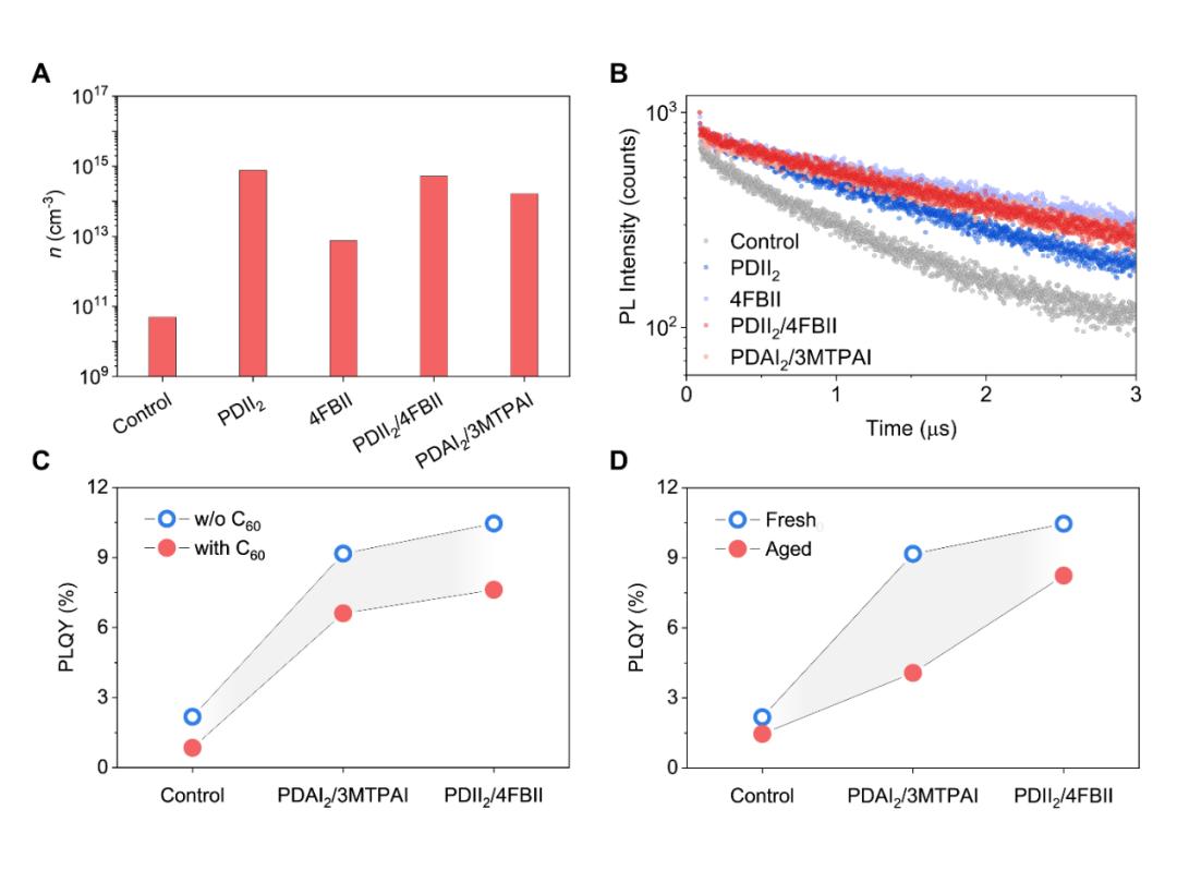 A.钙钛矿薄膜表面周围导带中不同配体处理的电子密度(n)。TRPL光谱用于不同配体处理的钙钛矿膜。C. PLQY是否存在C60沉积条件下钙钛矿薄膜。D. 在没有C60的情况下,钙钛矿膜经85°C、PLQY在相对湿度和光照老化前后50%。