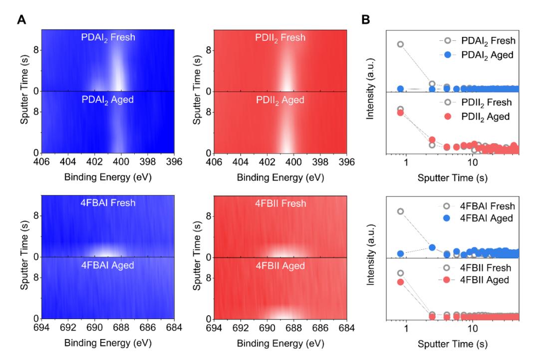 A.选择PDAI2和PDII2来处理新鲜和老化的钙钛矿薄膜。 1s 采用4FBAI和4FBII对新鲜和老化钙钛矿膜进行深度分析,并采用4FBAI和4FBII处理。 深入剖析1s。白表示最高强度,红蓝表示最低强度。PDAI2、PDII2、C3H12N2224FBAI和4FBII处理新鲜和老化钙钛矿薄膜 、C7H9FN 、C3H10N42 和C7H8FN2 ToF-SIMS分析数据。
