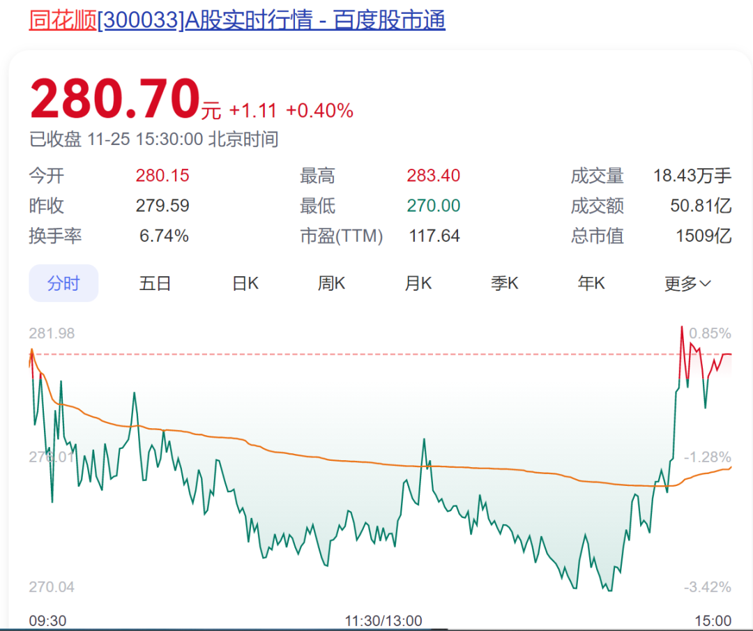 同花顺今日收于280.7元,上涨0.4%,总市值1509亿元。