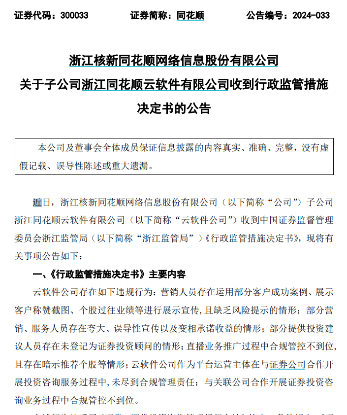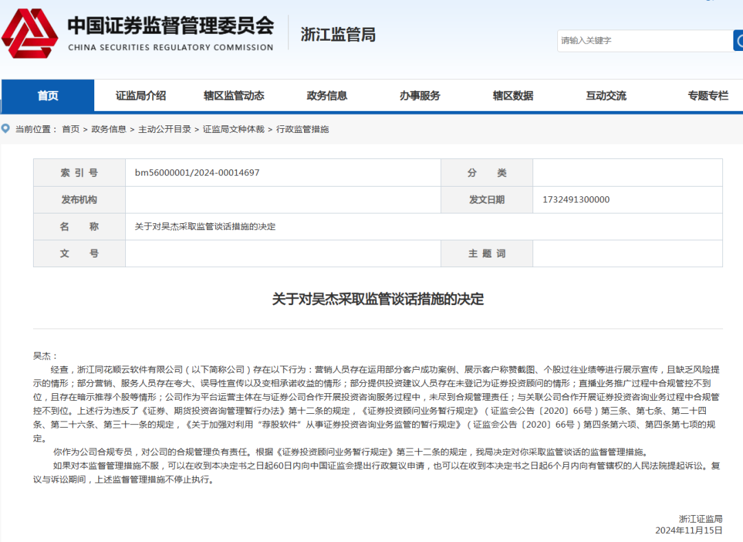 十一月二十五日,同花顺发布公告,近日,子公司浙江同花顺云软件有限公司收到我国证券会浙江监管局《行政监管措施决定》。
