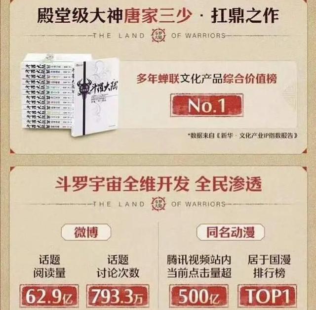 改编自唐家三少原著《斗罗大陆》的《斗罗大陆的燃魂战》, IP 不但长期蝉联文化产品综合价值榜第一,在其它领域也同样具有超高的热度。