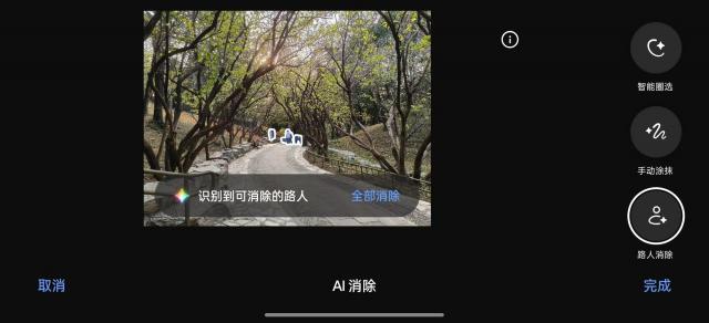 如上图所示,画面中的无关路人可以智能清除,一些棘手的区域可以手动精细选择,不仅视觉上更舒适,而且可以更好地突出画面主体。