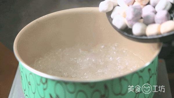 3. 锅里加水,沸水后放入小圆。如果有库存的芋头也可以用来做哟 ~