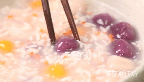 4. 等圆子浮起后转中火,加入甜酒酿造。