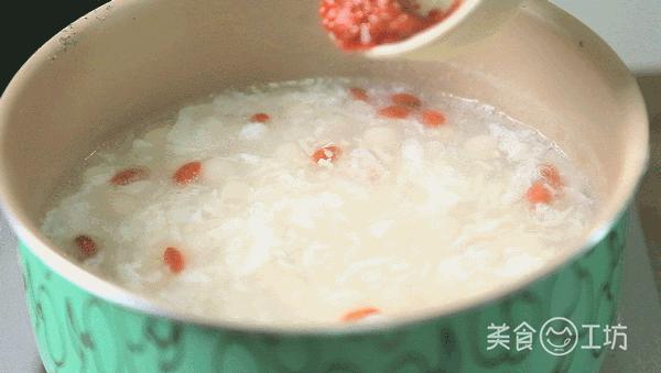 5. 加入少许枸杞后,取一个蛋清打散,转大火,边搅拌边搅拌。