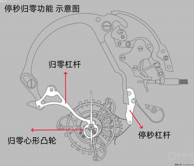 下一步,就是停秒归零。停秒归零,是一个复杂的功能,现在已经太不常见了。当拔出表把时,秒针会自动回到零位并停止秒,方便正确。停秒归零看似简单,但实际上机芯中增强了一套心形凸轮和归零推杆,类似于计时表,秒针归零,显著提高了复杂度。现在,基本上只有沛纳海和格拉苏蒂的原始议员才会停下来。 58 在天文台上使用。原来朗格也有 Sax-0-Mat 停秒归零技术,但是 2007 几年后,朗格逐渐停止使用。沛纳海是使用最多的。