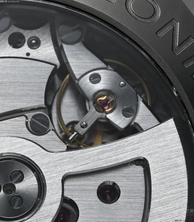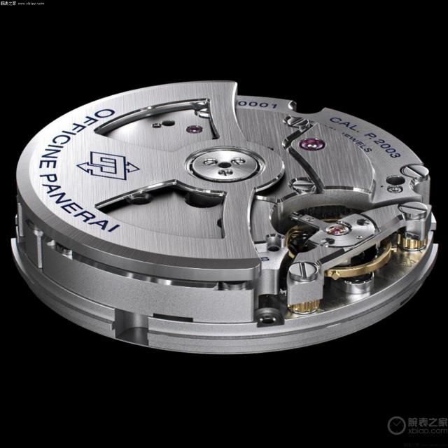 P2003在机芯装饰方面 自动机芯,是沛纳海一贯的大夹板,大规模拉丝。横跨摆陀夹板,用无卡重量微调摆陀,摆频 28800 次 / 时间。由于叠加功能多,还是自动上弦,所以机芯薄而厚。 8 mm。