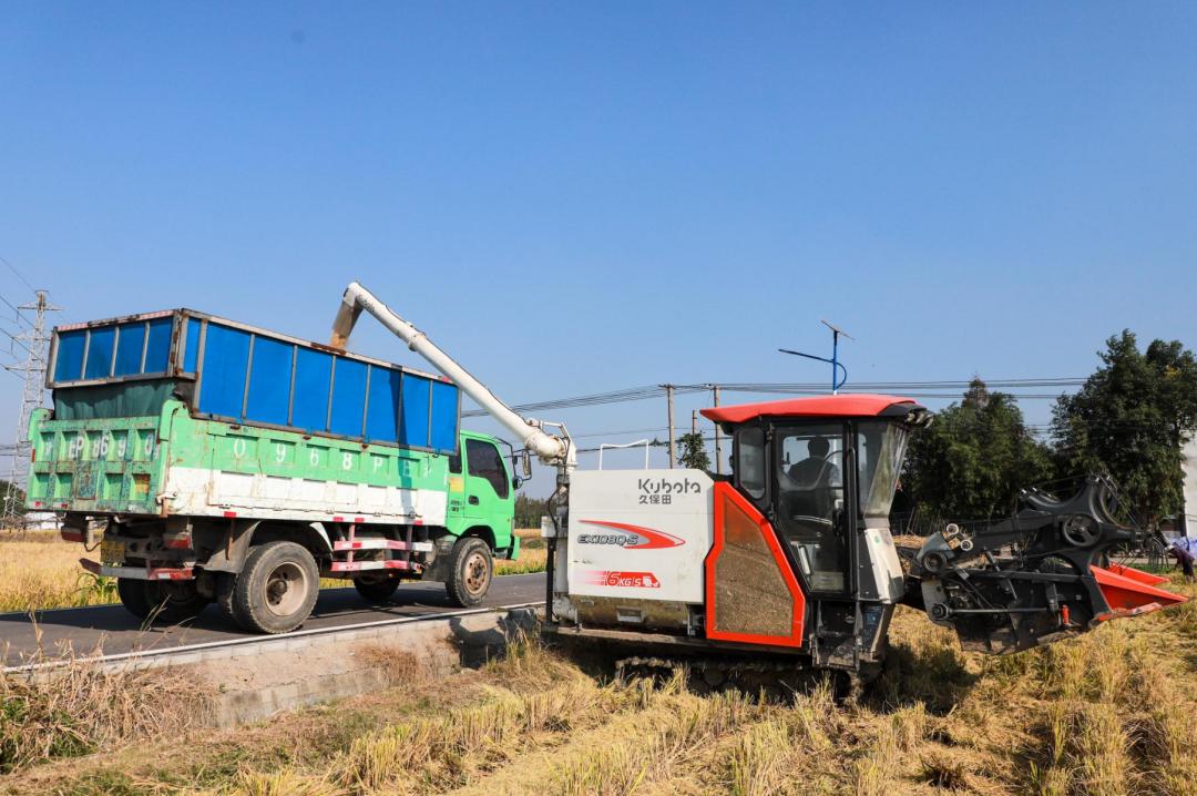 目前,正值我区大规模收获。23日上午,记者在张堰镇旧港村14组看到,两台收割机在金色稻田中来回穿梭。收获完成后,机器取下收获的稻穗,装入运输车辆,然后运往张堰镇秦阳村干粮基地进行干粮销售。