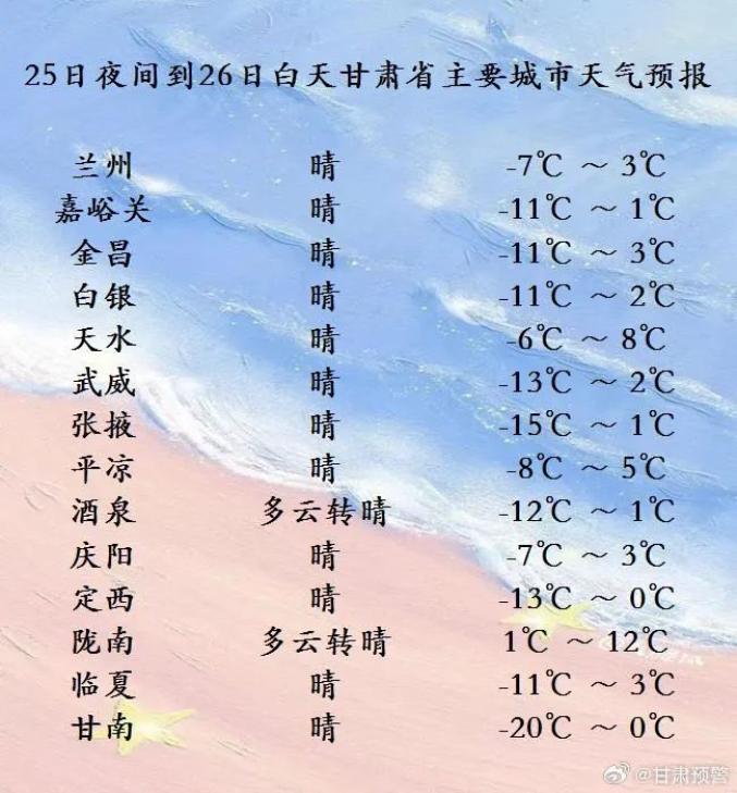 11月25日晚至11月26日白天(11月25日20:00-11月26日20:00),酒泉市多云转阴;这个省的其他地方都是晴天或者阴天。河西五市、白银、平凉、庆阳有4-5级西北风。此外,11月25日晚至11月26日上午,我省武威东侧大部分地区气温持续下降。