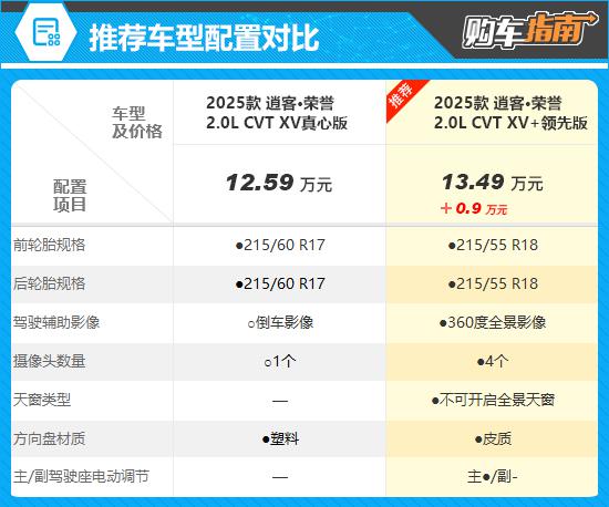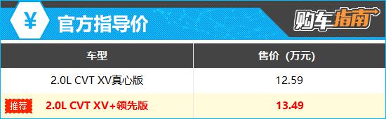 这次推荐的是价格 13.49 万元的 2.0L CVT XV 领先版本,通过配置对比可以看出,与入门级车型相比,推荐车型在驾驶辅助功能和舒适配置方面都有所升级,比如 360 度全景图像,4 一个摄像机,不能打开全景天窗和主驾驶座电动调节等。另外,方向盘材料也由塑料升级为皮革。推荐车型不仅免除了入门级车型的选择预算,而且价格也只贵出来。 0.9 万元,绝对物超所值,性价比极佳。