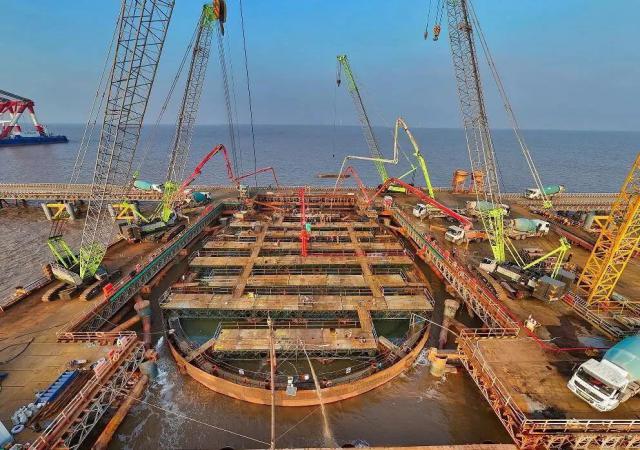 大桥重约 2500 一吨“钢巨无霸”在杭州湾扎根,这意味着这座国际跨海铁路大桥正式进入承台施工阶段。