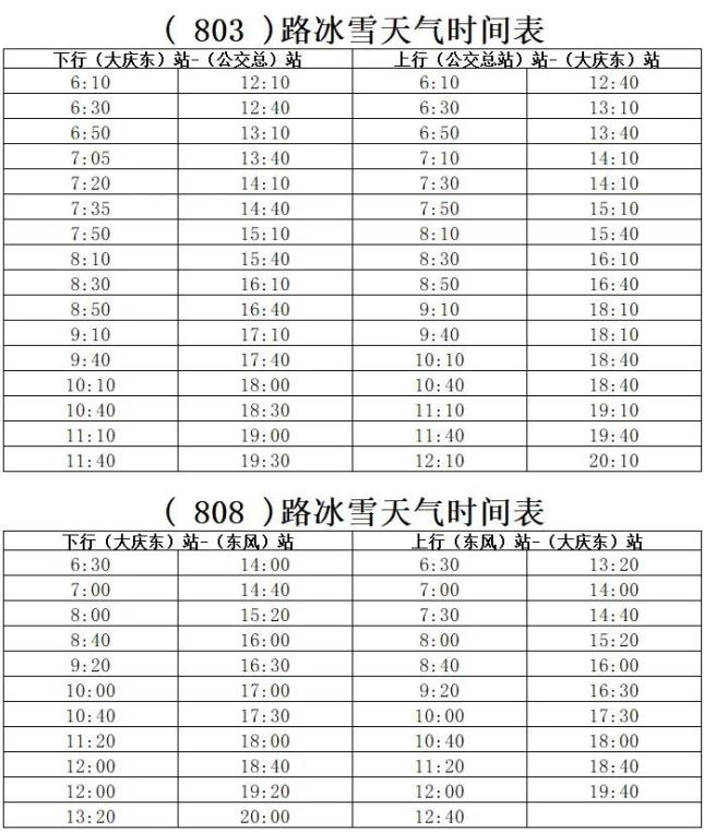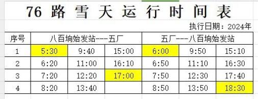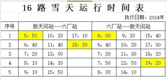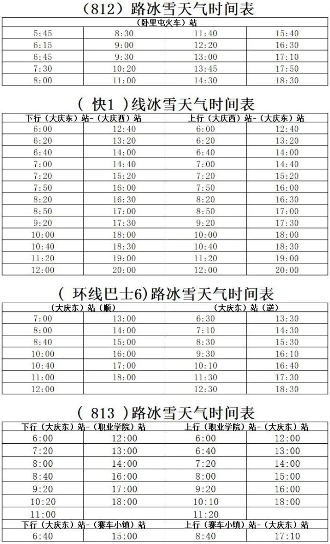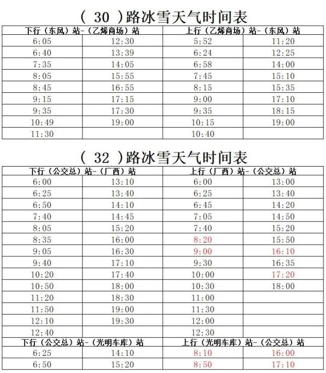 从2024年11月26日起,30路、32路、803路、808路、810路、812路、813路、快1线、环6路临时启用冰雪天气运行时间表,恢复时间根据道路情况另行通知。具体调整如图所示:
