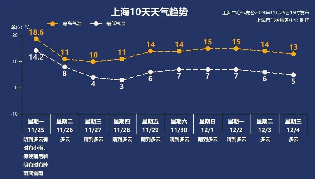 星期三,上海受寒高压控制,天气晴朗。早晨最低气温下降到4℃左右,白天最高气温也只有10℃,适当的冬季体验。