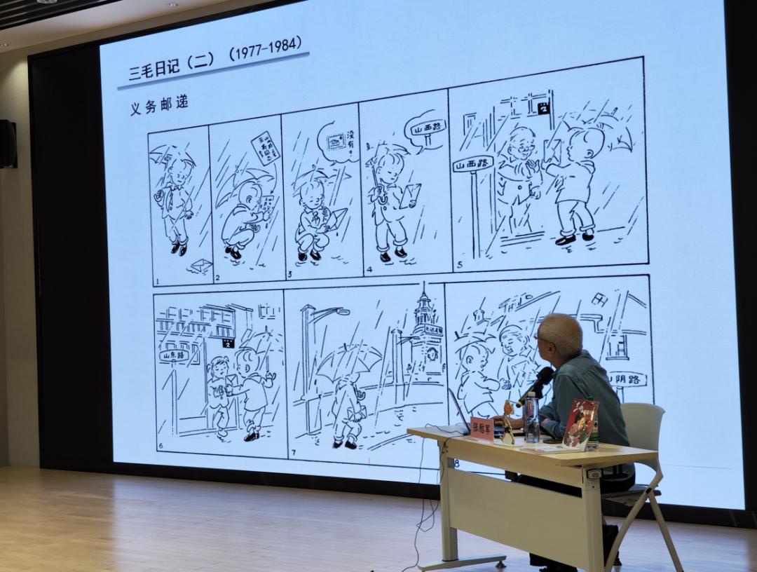 谈到三毛漫画,大家最熟悉的就是《三毛流浪记》和《三毛从军记》,这两部长篇连环漫画被称为“无文字文学佳作”。大师张乐平用画笔塑造了一个典型的艺术例子——三毛,表达了对当时社会现实的深刻攻击和对底层人民的深切关怀,故事情节坎坷,细节丰富。现场,张慰军向大家深情地讲述了父亲张乐平创作这两部传世作品的创作背景。