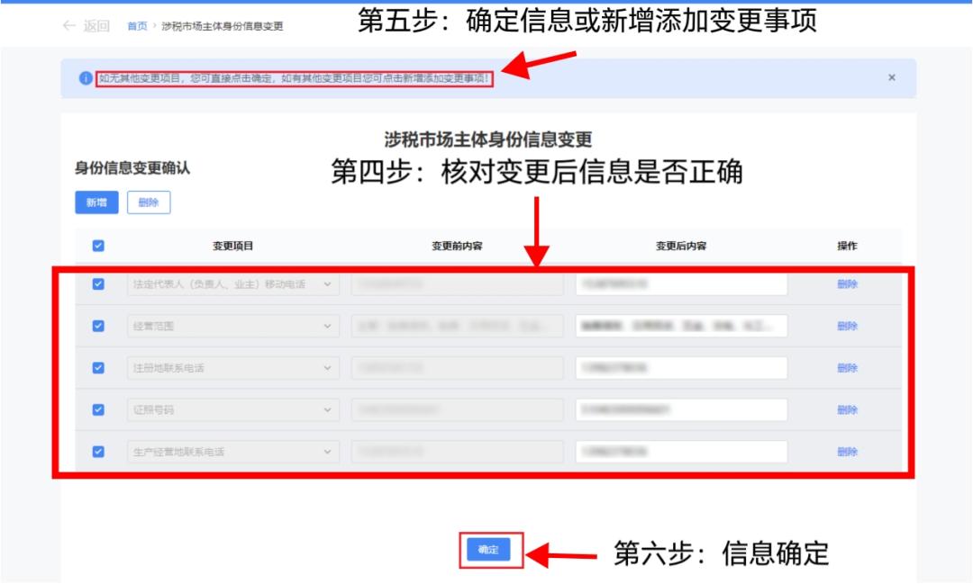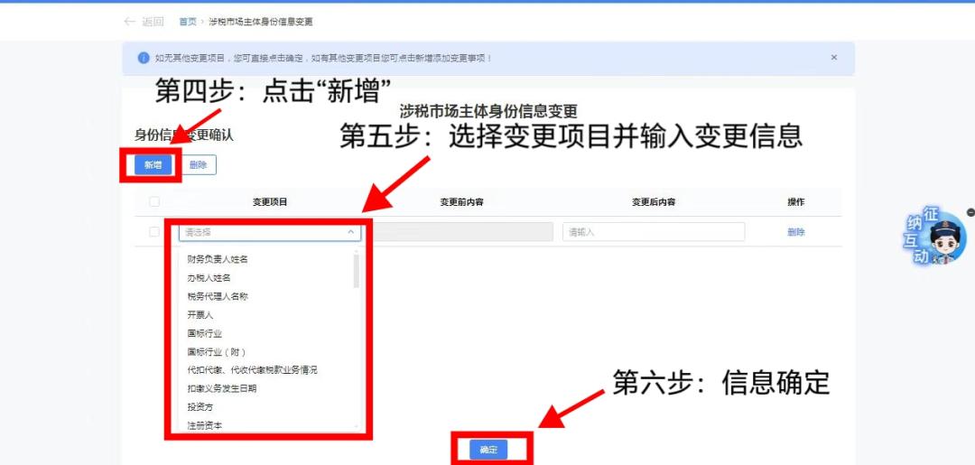 1.进入【涉税市场主体身份信息变更】,点击【添加】。选择变更项目,填写变更后的内容,查看变更项目,点击【确定】。